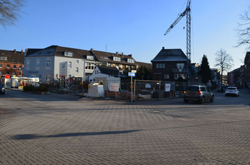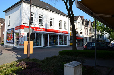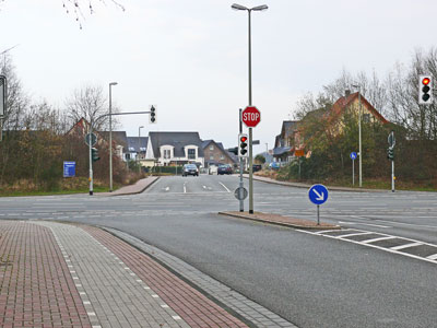Die neue Kreuzung -- Einfahrt in den neuen Ortsteil Hühnerheide. Blick auf die Kreuzung mit der Oberhausener Straße. Rechts geht es nach Oberhausen, links nach Dinslaken. | Jahrelang war hier ein Schreibwarenladen. |